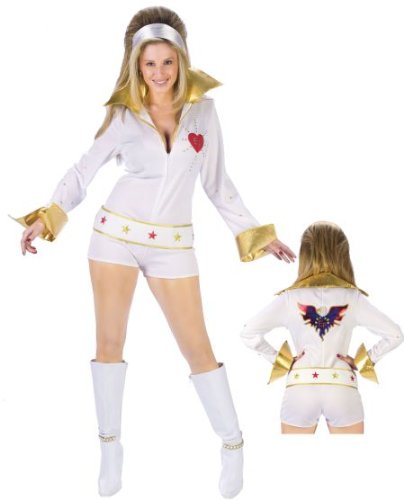 Our Sexy Female Elvis Costume features a zipper front short suit with eagle back, gold lame collar and cuffs and studded belt. This is the officially licensed Sexy Female Elvis Costume.